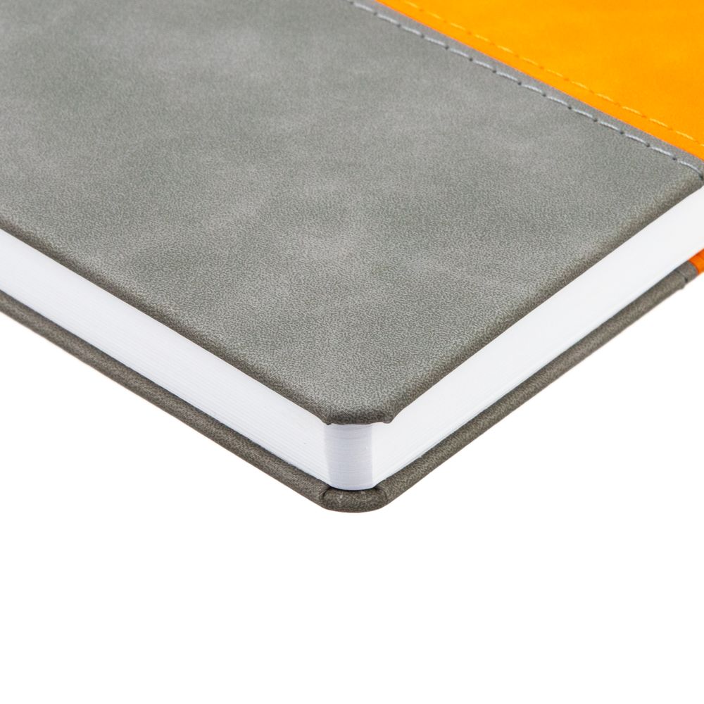 Ежедневник с твердой обложкой, без поролона, со сшивкой материалов Nubuck Touch, серый СС, и Nubuck Touch оранжевый ОО, дополнен двойным ляссе и петлей-резинкой для ручки.
