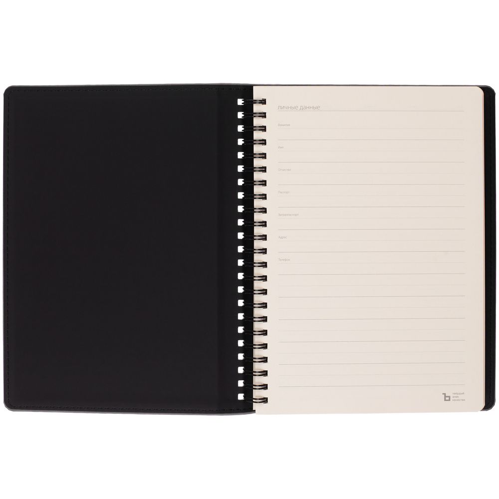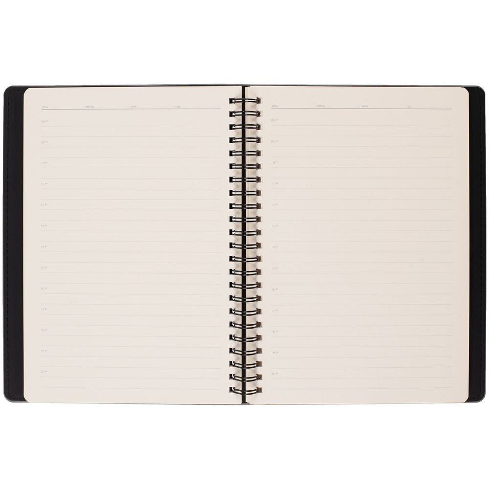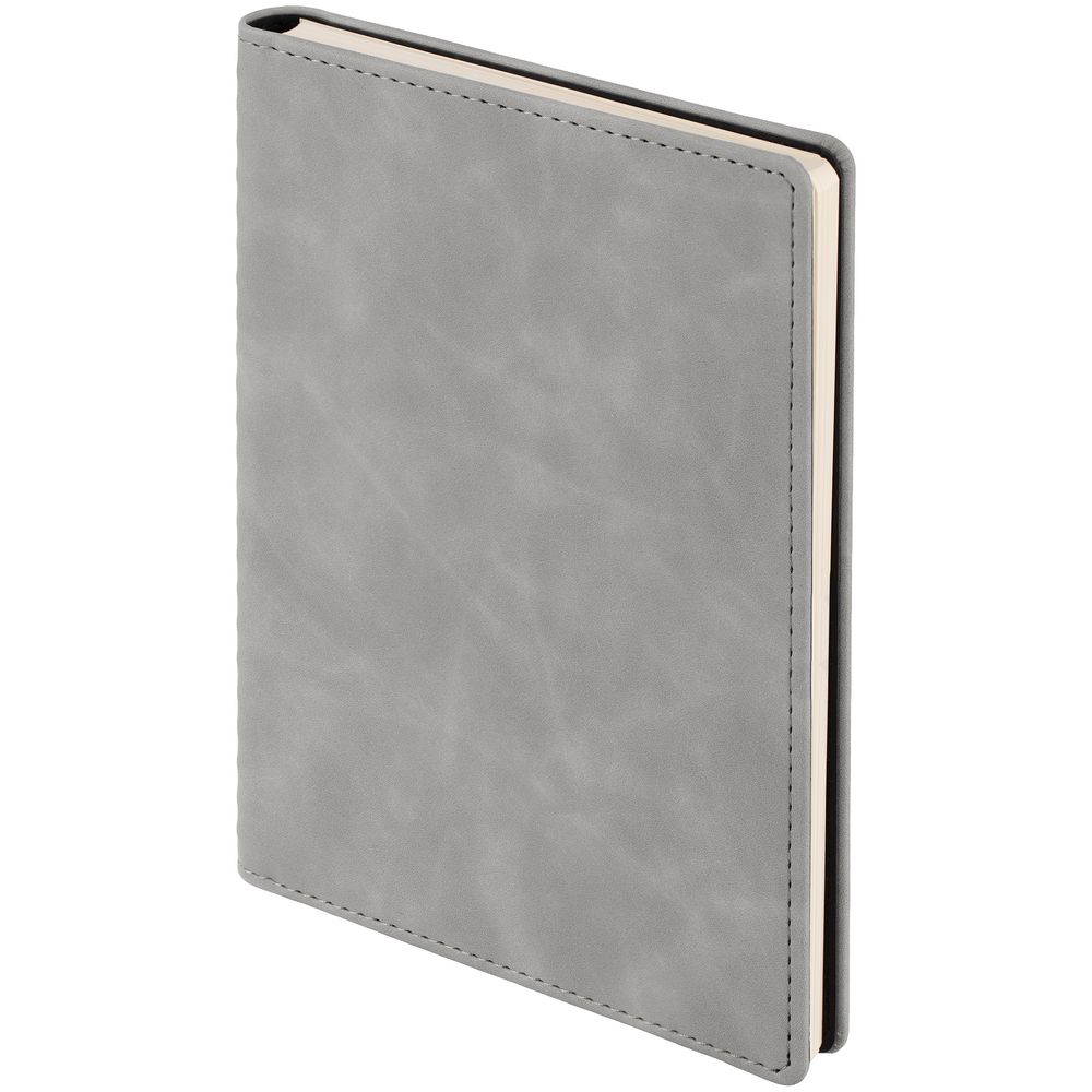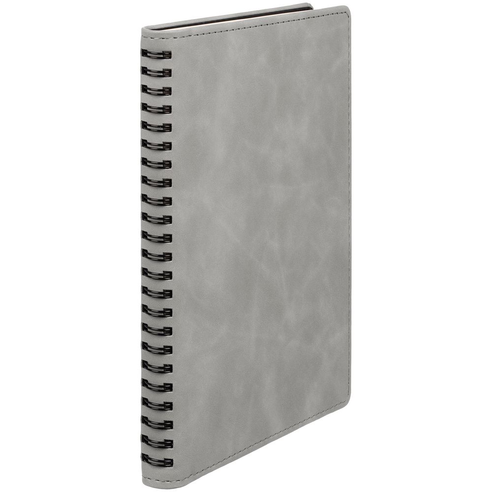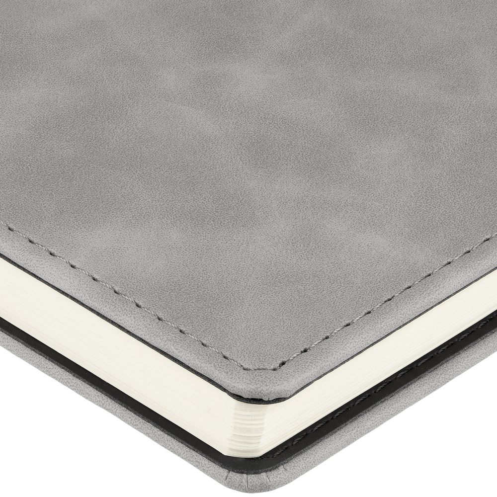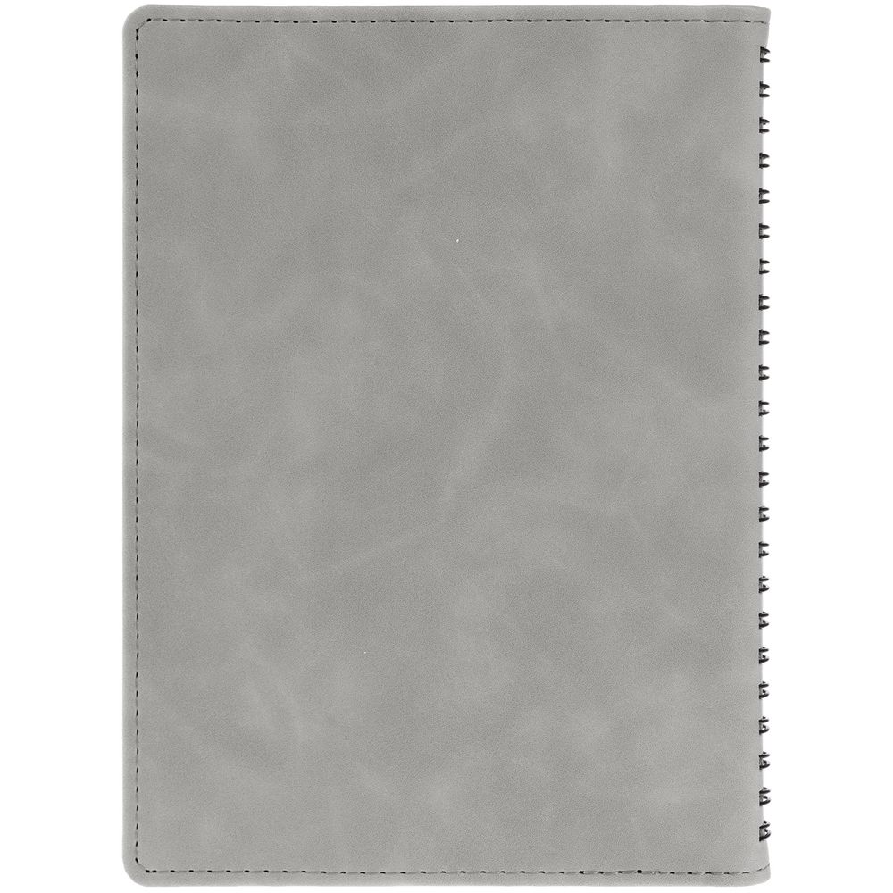 Ежедневник с блоком на пружине в твердой обложке, выполнен из материалов Nubuk Touch, серый СС и Soft Touch, черный AA.