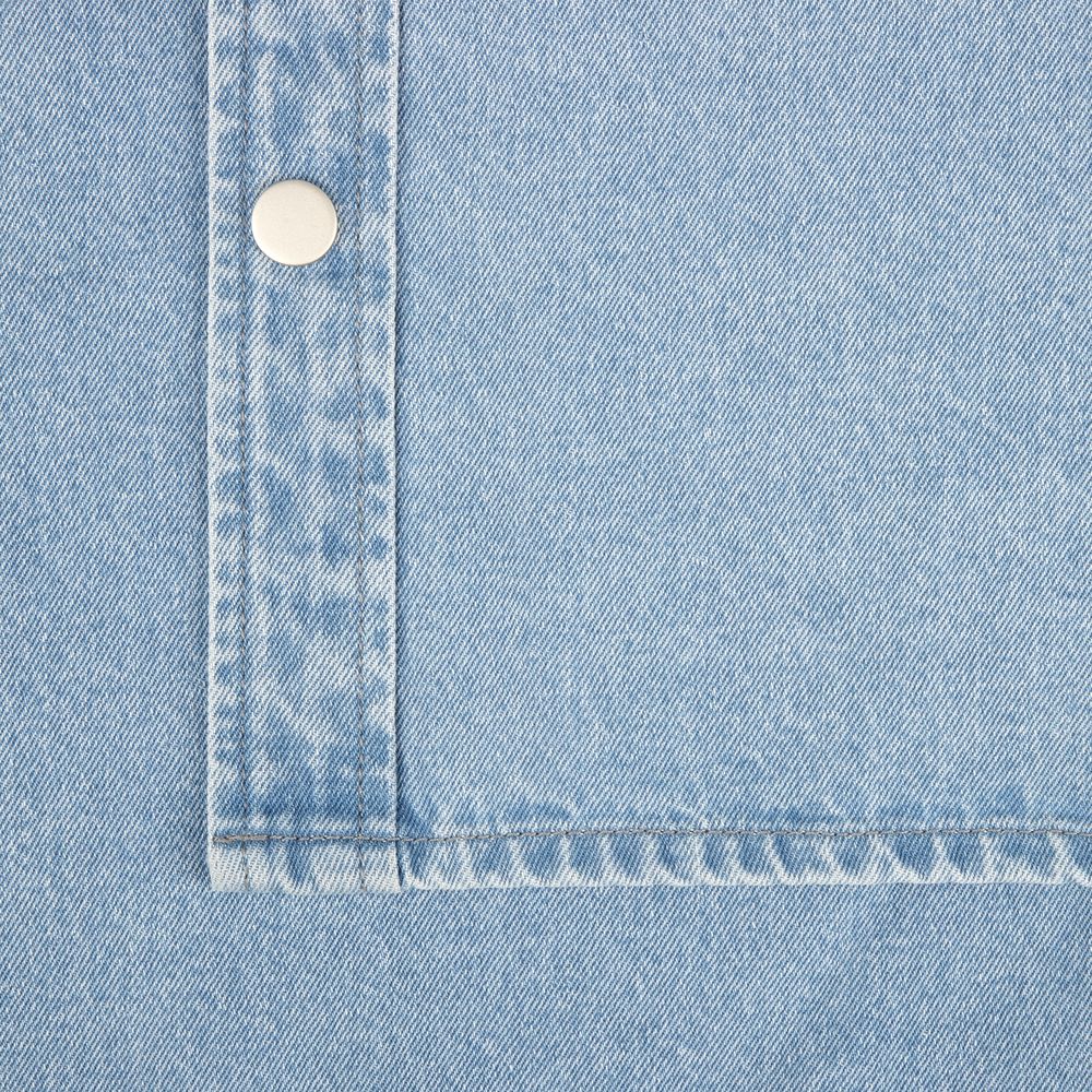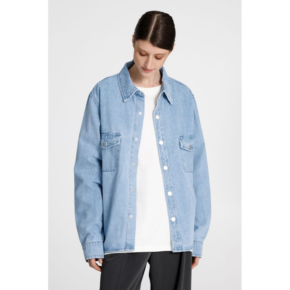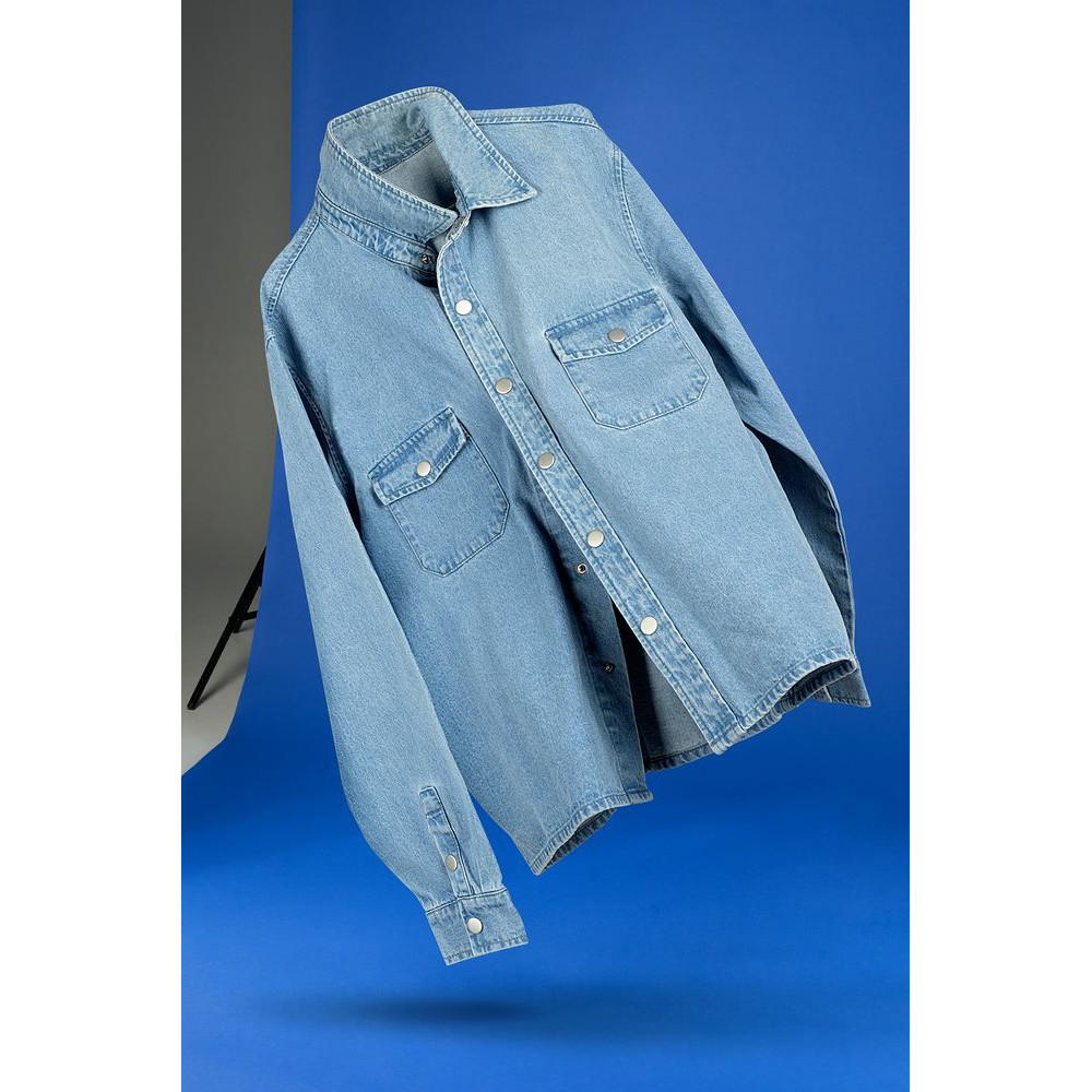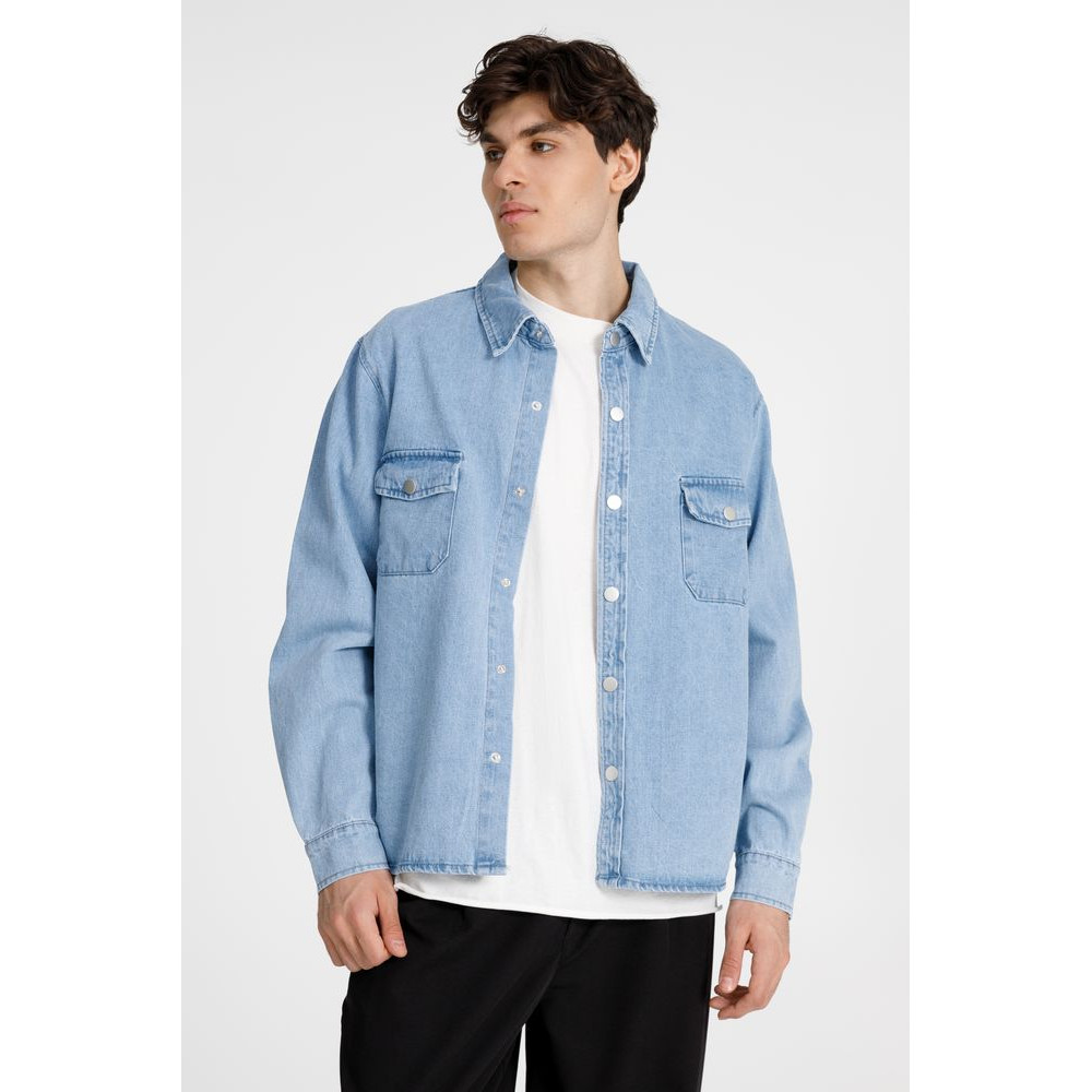 Джинсовая куртка-рубашка унисекс на кнопках прямого силуэта.