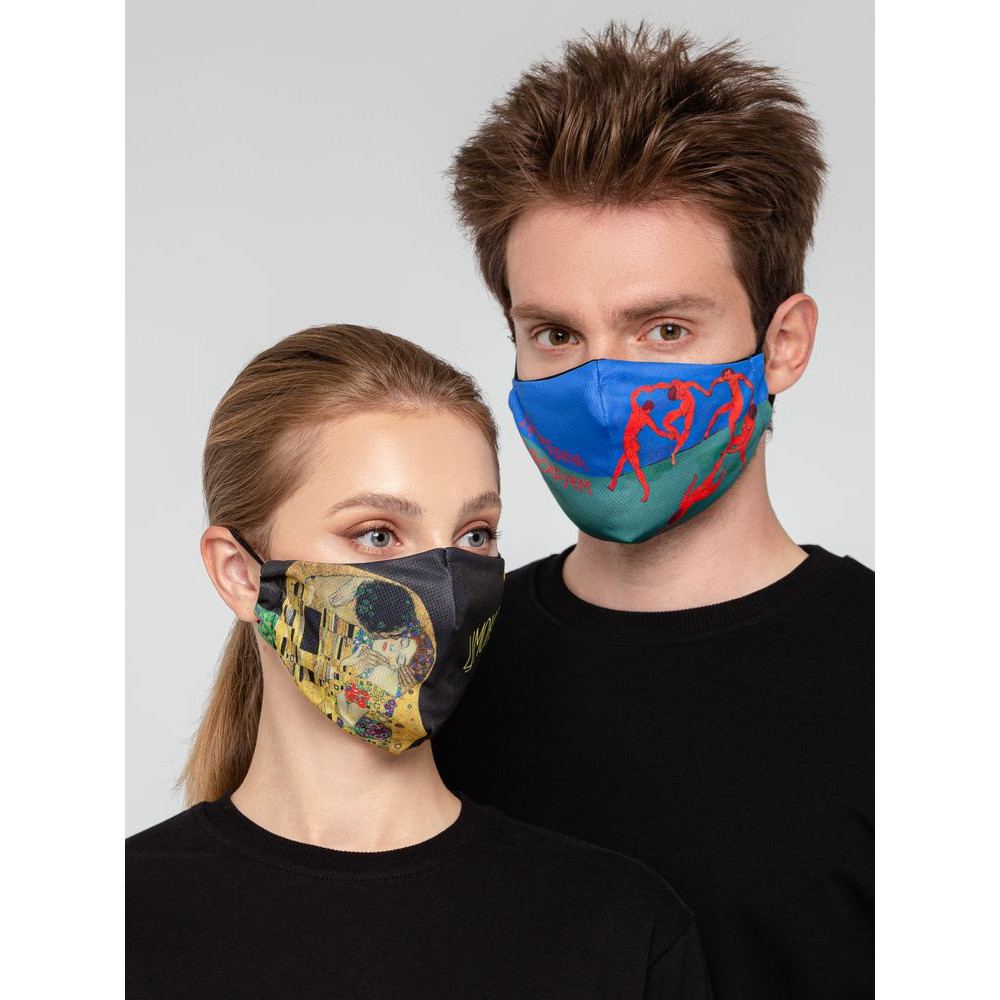 Принт создан по мотивам знаменитой картины Анри Матисса «Танец».Многоразовая маска из дышащей ложной сетки с ярким принтом с гигиенической хлопковой подкладкой и заушниками-резинками.