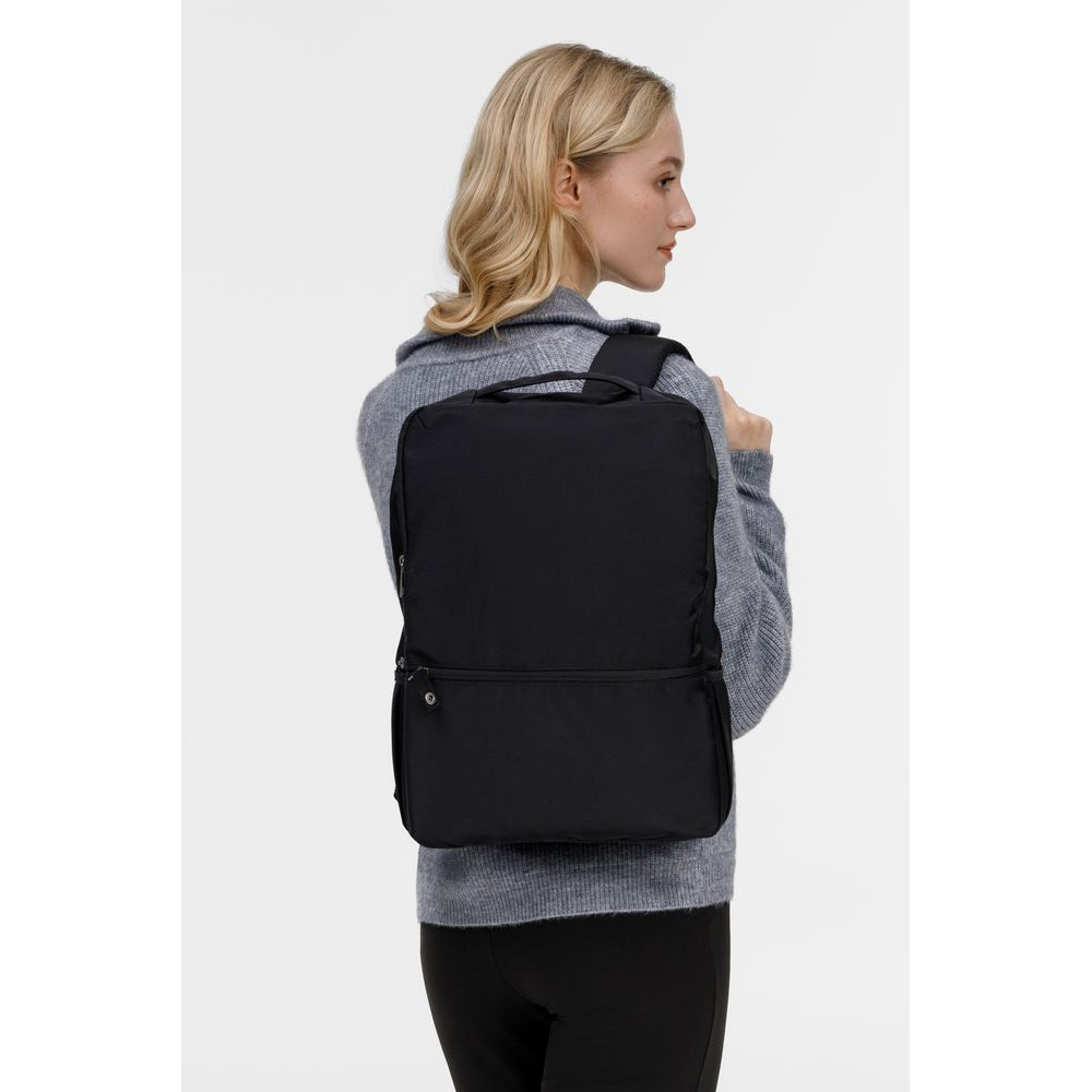 Особенность рюкзака — акцент на безопасность. Продуманная конструкция со смещенной к спинке молнией основного отделения усложняет несанкционированный доступ к содержимому, а пуллер на молнии наружного кармана можно пристегнуть к боковой части рюкзака, чтобы уменьшить вероятность случайного открытия.