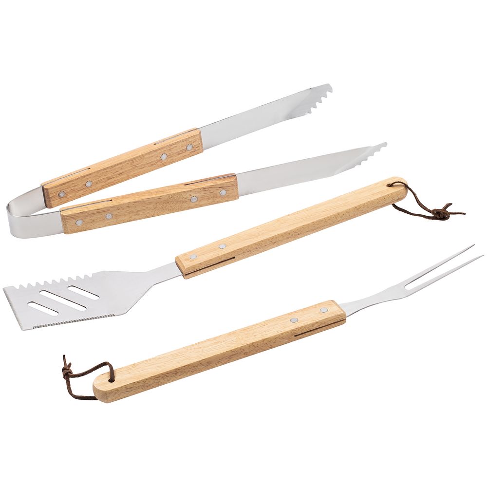 С надежными инструментами для барбекю No Misteak не грозит столкнуться с какой-либо ошибкой в приготовлении мяса — с ними удобно управляться, а значит, и еда получается вкуснее. Деревянные ручки не нагреваются — и на них хорошо ложится гравировка, а прочный полированный металл легко моется и не деформируется при работе с горячими продуктами и поверхностями.В набор входят: щипцы, вилка и лопатка.