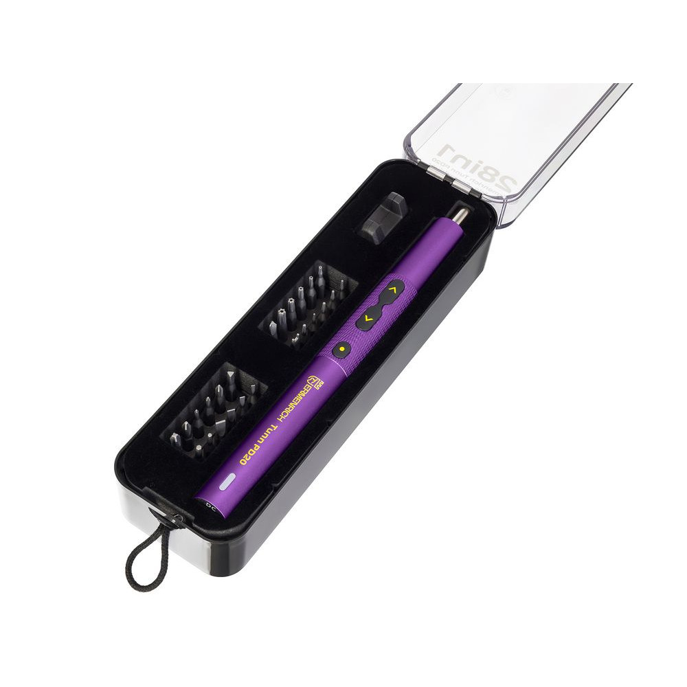В комплекте электрическая отвертка для точных работ, 24 биты, намагничиватель-размагничиватель, монтажная лопатка, кабель USB Type-C. Отвертка упакована в пластиковый кейс.- Число оборотов холостого хода: 300 об/мин