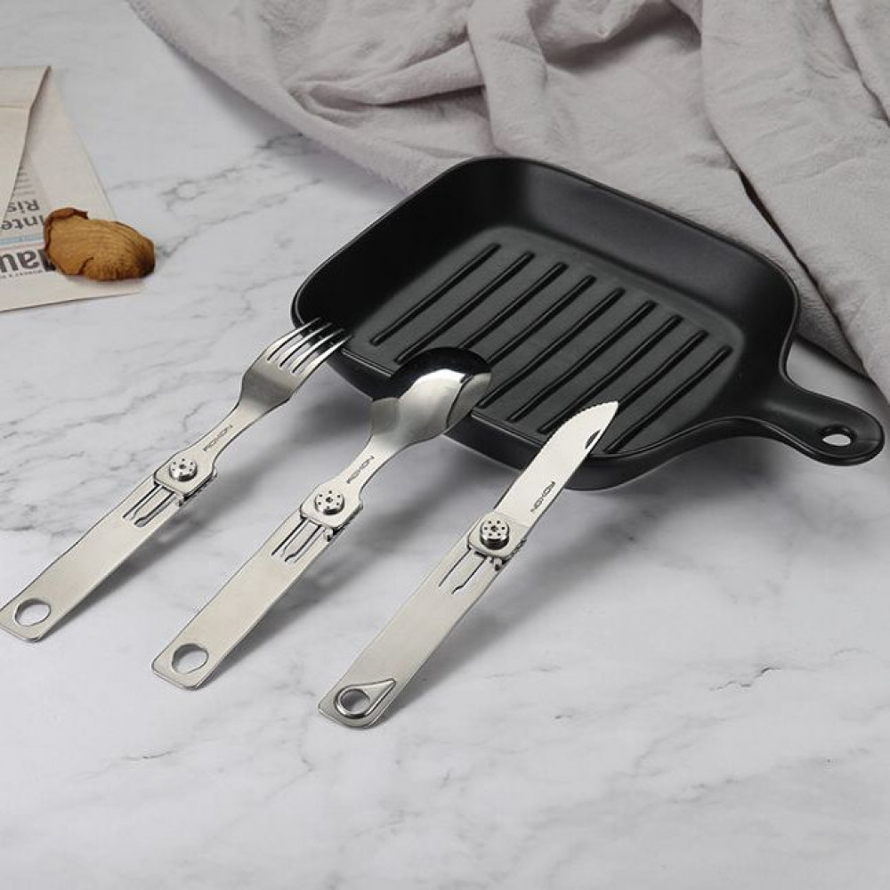 Набор столовых приборов из ложки, вилки и ножа с серрейторной заточкой.